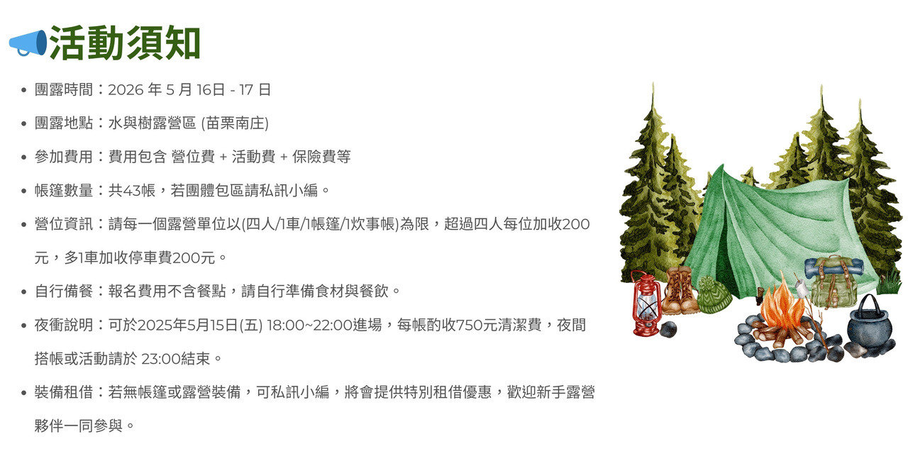 5.本露營區屬開放空間,個人安全、用品、財務請自行負責。